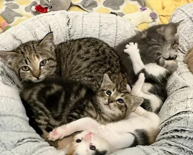 佩布尔斯并不介意小猫们的吵闹,相反,它很享受它们的陪伴,它已经完全融入了这群小可爱之中。