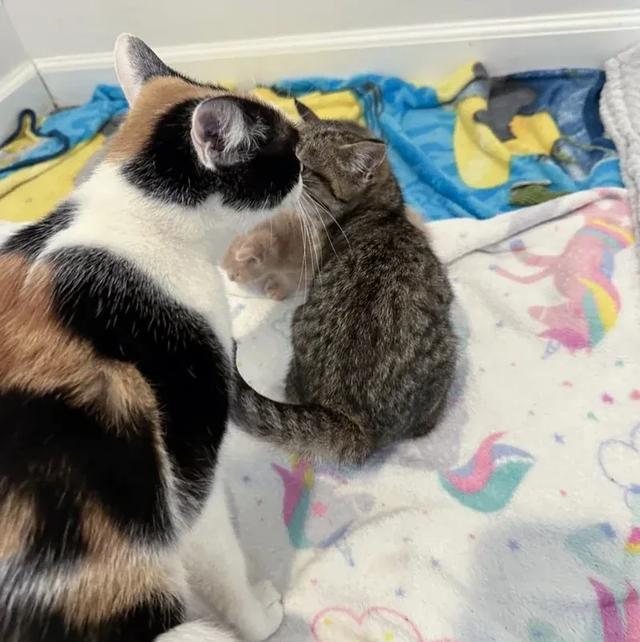 志愿者将佩布尔斯放在了萨弗伦和它的小猫们旁边,希望这个猫咪家庭可以接纳它。