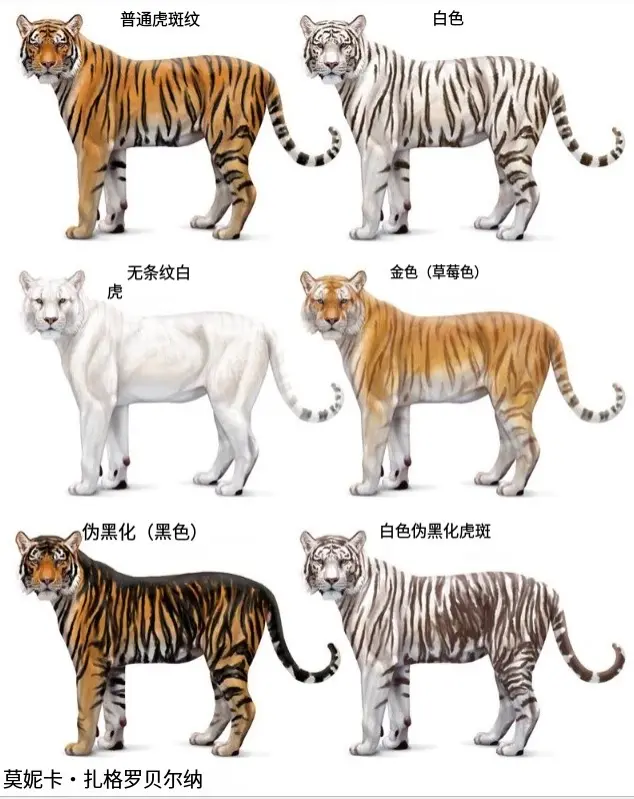 然而,在圈养环境之下,老虎的毛色变得非常多样化,下面是6种圈养老虎的皮毛: