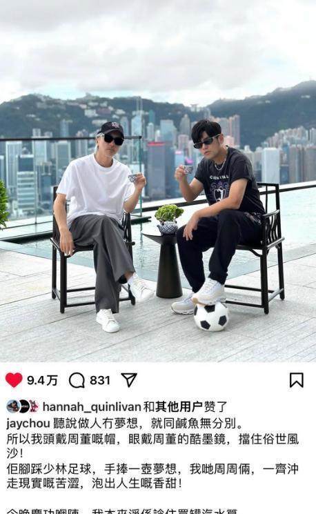 周杰伦也转发了周星驰发的照片,照片中的两人坐在木椅上,星爷翘着二郎腿,周杰伦脚踩着足球,两人都拿着茶杯,都戴着墨镜对着镜头拍照,有一种拍海报的既视感。