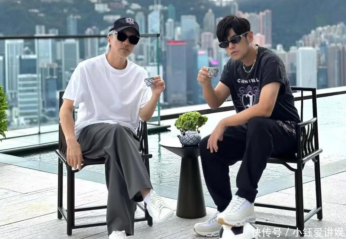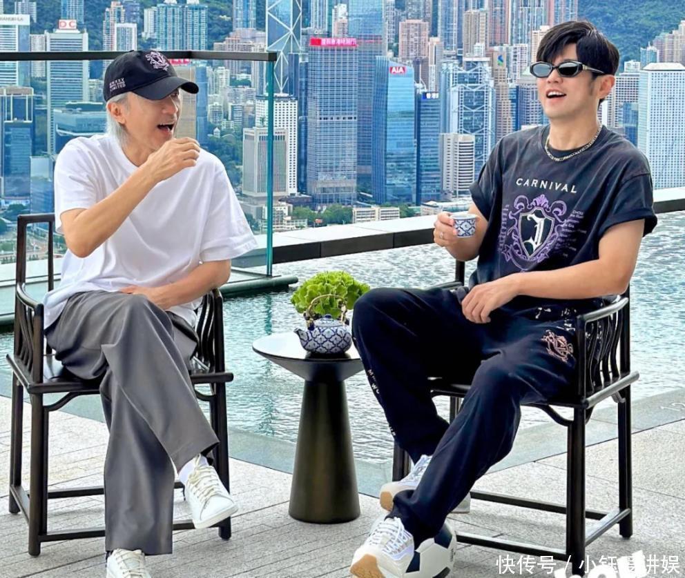 在照片中可以看到周星驰穿着白色短袖体恤搭配灰色的宽松长裤与白色板鞋,戴着黑色棒球帽,还是一如既往的休闲风格。周杰伦也是保持着差不多的休闲风格,他穿着黑色体恤搭配深色长裤与白色球鞋,戴着墨镜。两人坐在阳台的休息区,一起喝着茶聊天,彼此都笑得很开心,气氛很不错!